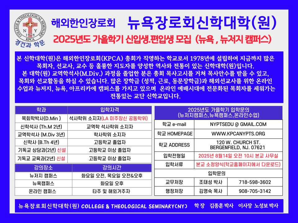 2025년 가을학기 신입생.편입생 모집 (뉴욕 캠퍼스, 뉴저지 캠퍼스) admin06/22/2025메인페이지-신학교공지, 신/편입생 모집요강 다운로드를 원하시면 이곳을 클릭해주세요. >> 클릭